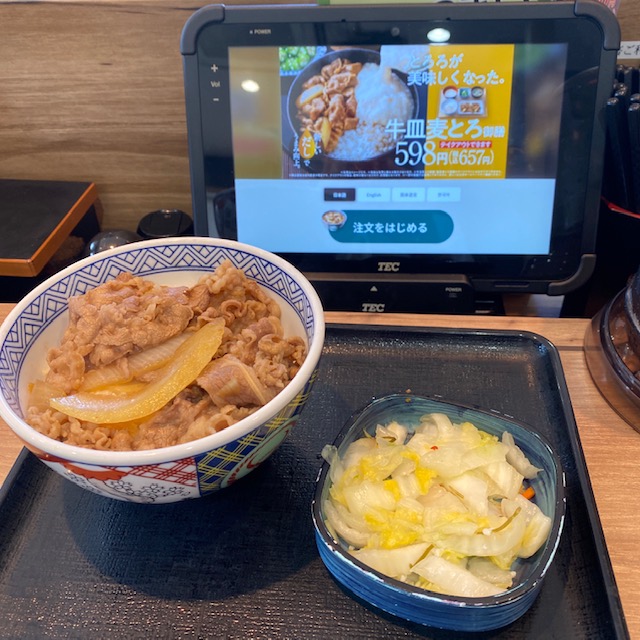 タブレット注文、声に出さなくて良いから便利とも思えるが、味気ない。 牛丼まで味気ない気がする。