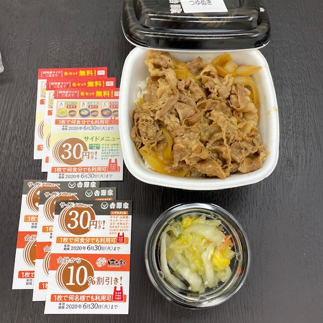 吉野家です。 牛丼並(つゆぬき)が片寄っちゃいました。 2枚もサービス券配ってた。